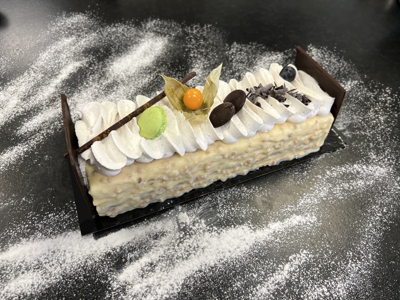 Biscuit madeleine vanille, croustillant spéculos, confit de mandarine, crémeux vanille, mousse mandarine et glaçage rocher avec amandes hachées, chantilly vanille