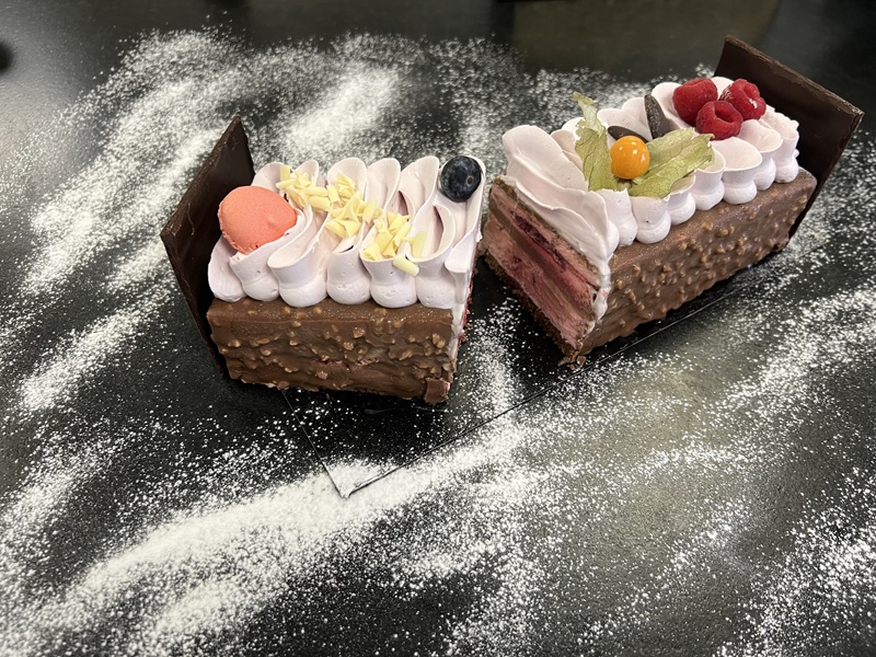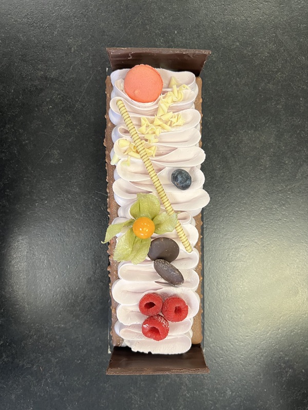 Biscuit chocolat, confit de framboise; crémeux chocolat au lait, mousse à la framboise, glaçage rocher au chocolat lait et amandes hachées, chantilly à la framboise
