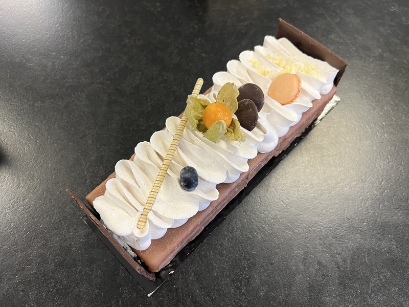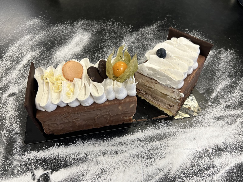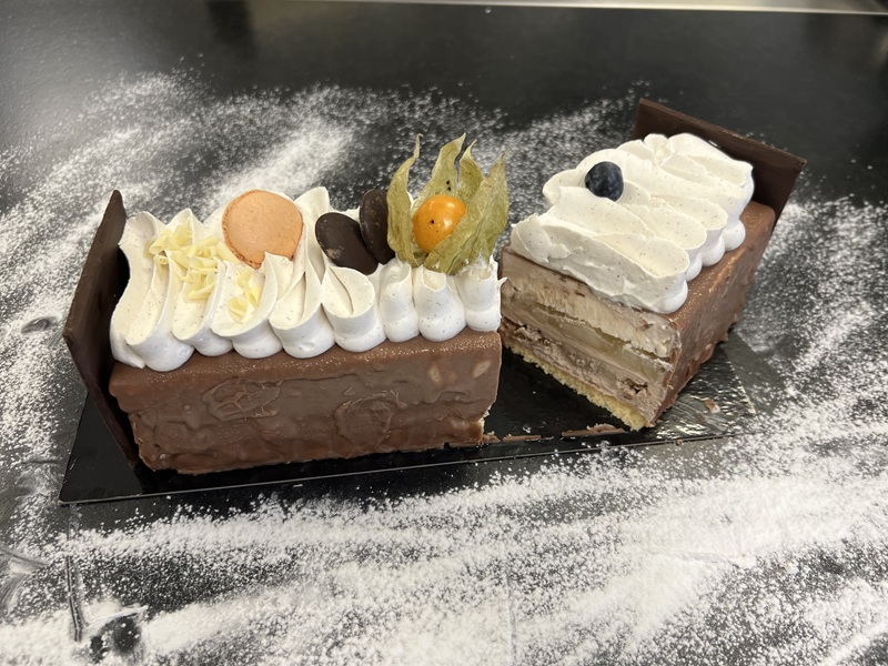 Biscuit au chocolat, croustillant praliné, compotée de poires, chantilly à la poire, mousse chocolat au lait, glaçage rocher au chocolat lait caramel, chantilly à la vanille