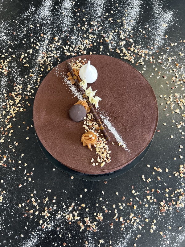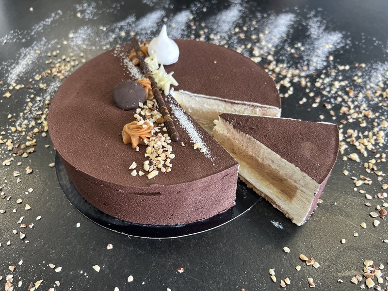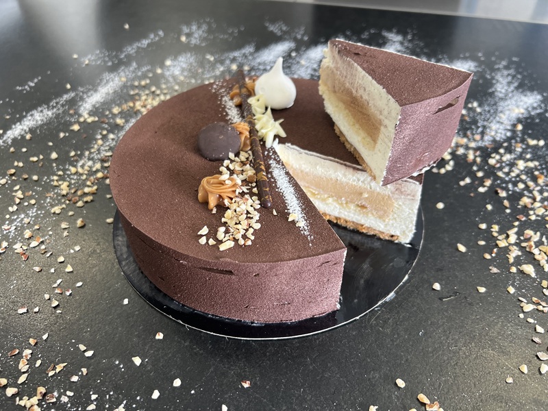 Croustillant praliné/spéculoos, crémeux caramel, biscuit joconde aux amandes, ganache montée à la vanille, finition velour chocolat